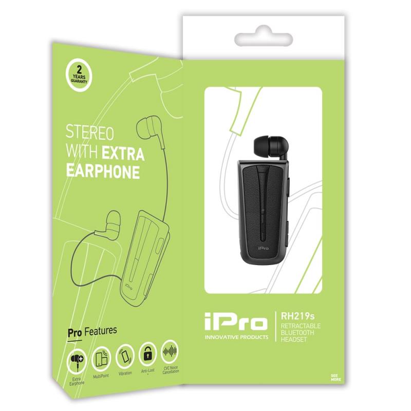 Το RH219s είναι ένα πρωτοποριακό προϊόν της iPro με δόνηση, καλώδιο περιέλιξης & αποσπώμενο 2ο ακουστικό! Έχει εξαιρετική ποιότητα ήχου, είναι ιδιαίτερα ελαφρύ μόλις 18,5gr & άνετο για καθημερινή χρήση. Διαθέτει τεχνολογία Multipoint που επιτρέπει την ταυτόχρονη σύνδεση και διαχείριση κλήσεων δύο συσκευών με το ακουστικό. Χάρη στη λειτουργία Power Display, σας δίνεται η δυνατότητα παρακολούθησης του επιπέδου μπαταρίας του Bluetooth από την οθόνη του κινητού σας!* Διαθέτει ενσωματωμένα φωνητικά μηνύματα προτροπής σε Ελληνικά ή Αγγλικά που επιτρέπουν στον χρήστη να ενημερώνεται για την τρέχουσα κατάσταση του ακουστικού αλλά και τον αριθμό του καλούντος. Παράλληλα χάρη στη λειτουργία Anti-Lost, το iPro RH219s θα σας ειδοποιήσει μέσω δόνησης όταν η απόσταση μεταξύ της συσκευής που έχει γίνει σύζευξη επεκταθεί των 10m (προβλεπόμενο εύρος λειτουργίας). Προσφέρει πολλαπλές λύσεις μεταφοράς χρησιμοποιώντας είτε το κλιπ είτε το strap λαιμού που περιλαμβάνεται στην συσκευασία, ώστε να επιλέξετε τον βέλτιστο για εσάς τρόπο.