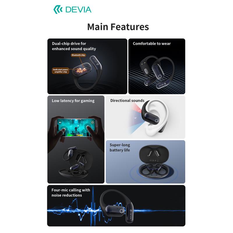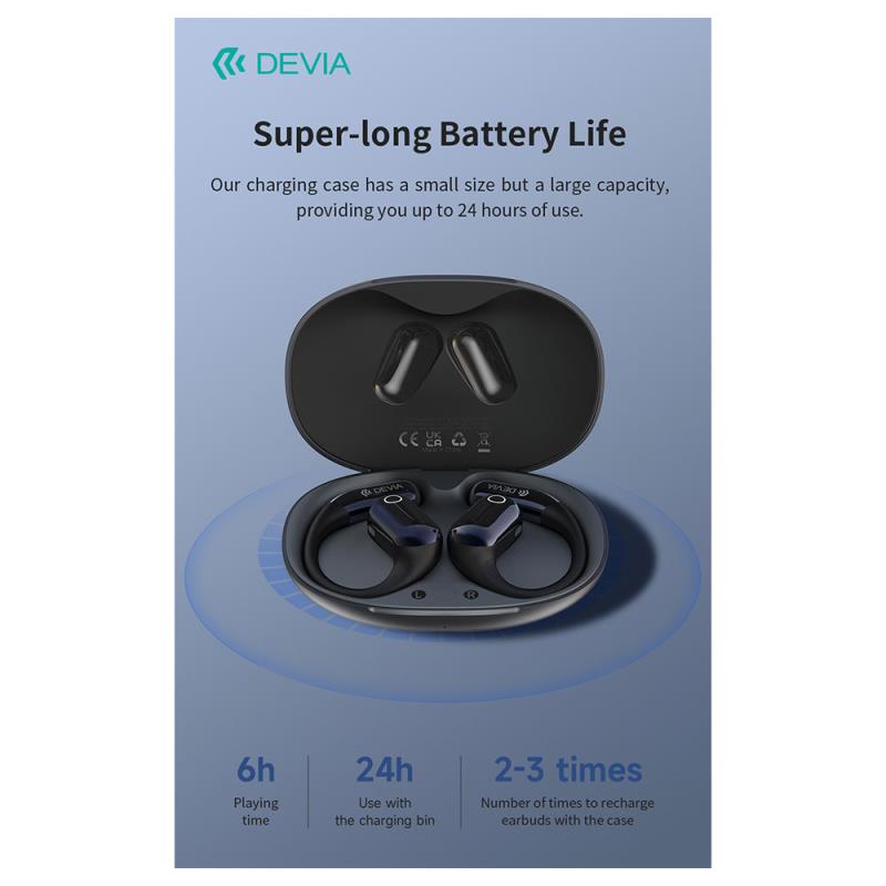 Τα Devia OWS Ultra1 παρέχουν καθαρό και σταθερό ήχο, με έως 6 ώρες λειτουργίας και θήκη φόρτισης που προσφέρει 2–3 επιπλέον φορτίσεις, καλύπτουν άνετα την καθημερινή χρήση. Ο εργονομικός σχεδιασμός με άγκιστρο εξασφαλίζει σταθερή εφαρμογή, ενώ τα 4 μικρόφωνα βελτιώνουν σημαντικά την ποιότητα των κλήσεων. Διαθέτουν gaming mode χαμηλής καθυστέρησης και εμβέλεια έως 15 μέτρα, ιδανικά για μουσική, κλήσεις & παιχνίδι χωρίς διακοπές.