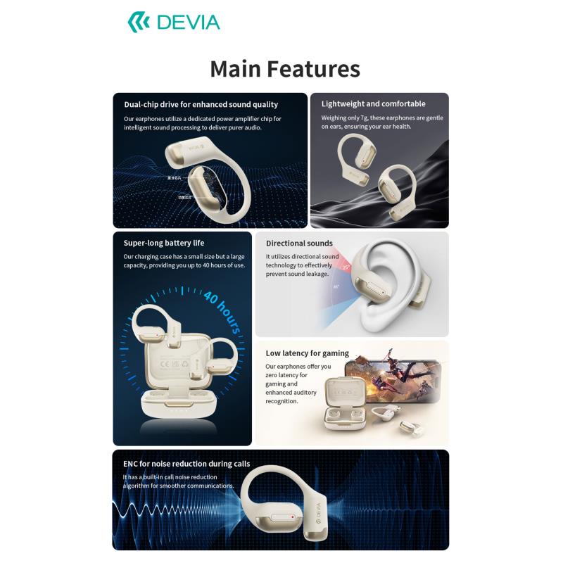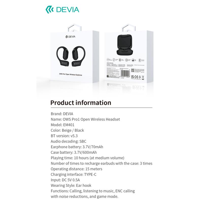 Τα Devia OWS Pro1 EM401 είναι ελαφριά (7g) πραγματικά ασύρματα ακουστικά με σχεδιασμό γάντζου για άνεση και σταθερότητα. Διαθέτουν επεξεργασία ήχου διπλού chip και ENC για καθαρότερες κλήσεις. Με Bluetooth 5.3, low latency για gaming και ήχο SBC, προσφέρουν έως και 10 ώρες αναπαραγωγής ανά φόρτιση, με δυνατότητα επέκτασης έως 40 ώρες με τη θήκη 600mAh. Η θήκη φόρτισης USB C επαναφορτίζει τα ακουστικά 70mAh έως και τρεις φορές, εξασφαλίζοντας μακροχρόνια απόδοση.