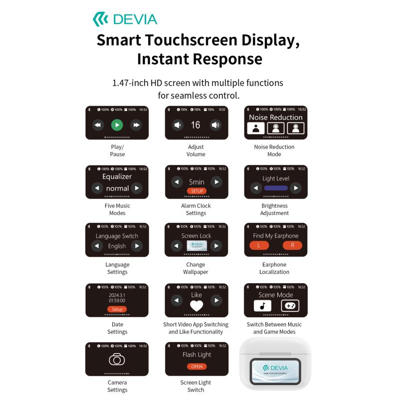 Τα ακουστικά Devia AI TWS Pro4 EM417 επαναπροσδιορίζουν τον ασύρματο ήχο με μετάφραση σε πραγματικό χρόνο με τεχνητή νοημοσύνη, καταγραφή συσκέψεων και μετάφραση κλήσεων ήχου/βίντεο. Διαθέτουν ακύρωση θορύβου ANC (30dB) και HD κλήσεις, εξασφαλίζοντας καθαρή επικοινωνία και καθηλωτικό ήχο. Η οθόνη αφής 1.47 ιντσών προσφέρει εύκολο έλεγχο της μουσικής, των λειτουργιών ANC και της εξατομίκευσης. Με 6 ώρες αναπαραγωγής (30 ώρες με τη θήκη), γρήγορη φόρτιση USB C και έξυπνες λειτουργίες όπως ανίχνευση εντός του αυτιού και λειτουργία παιχνιδιού, είναι σχεδιασμένο για εργασία, ταξίδια και ψυχαγωγία.