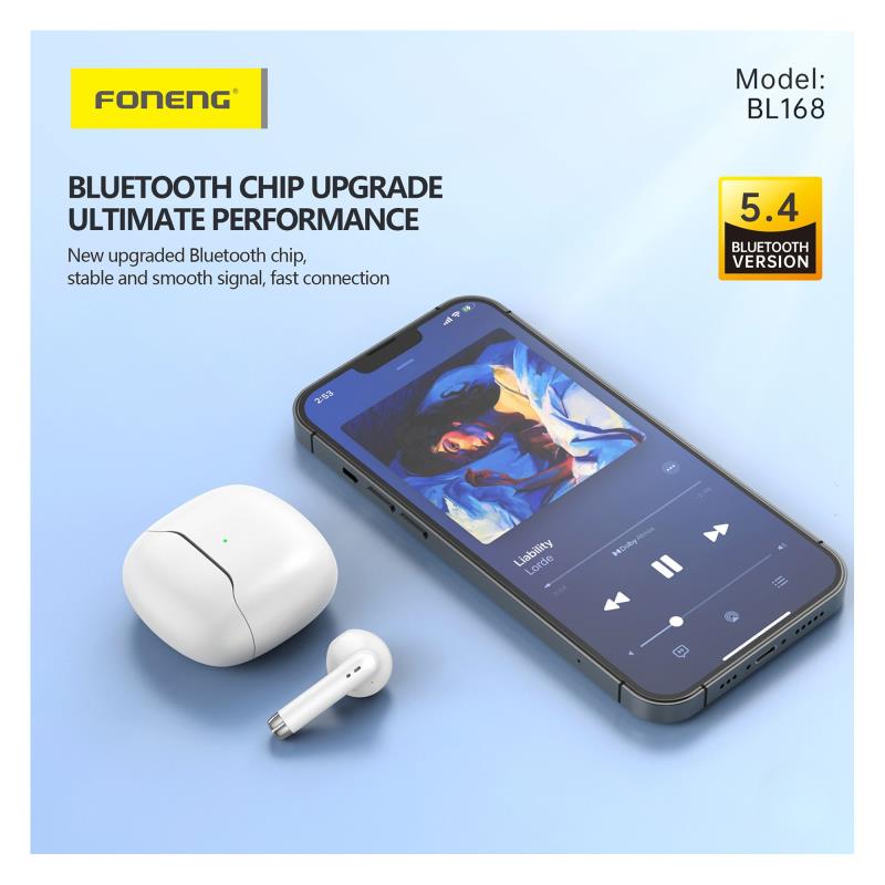 Τα Foneng BL168 TWS είναι true wireless ακουστικά Bluetooth 5.4 με εμβέλεια έως και 12m. Προσφέρουν εξαιρετική αυτονομία με 4–5 ώρες αναπαραγωγής μουσικής με μία φόρτιση και αναμονή έως 25 ώρες, ενώ η θήκη φόρτισης (με μπαταρία ~320 mAh) επαναφορτίζει τα ακουστικά γρήγορα μέσω USB C για εκτεταμένη χρήση όλη μέρα.
