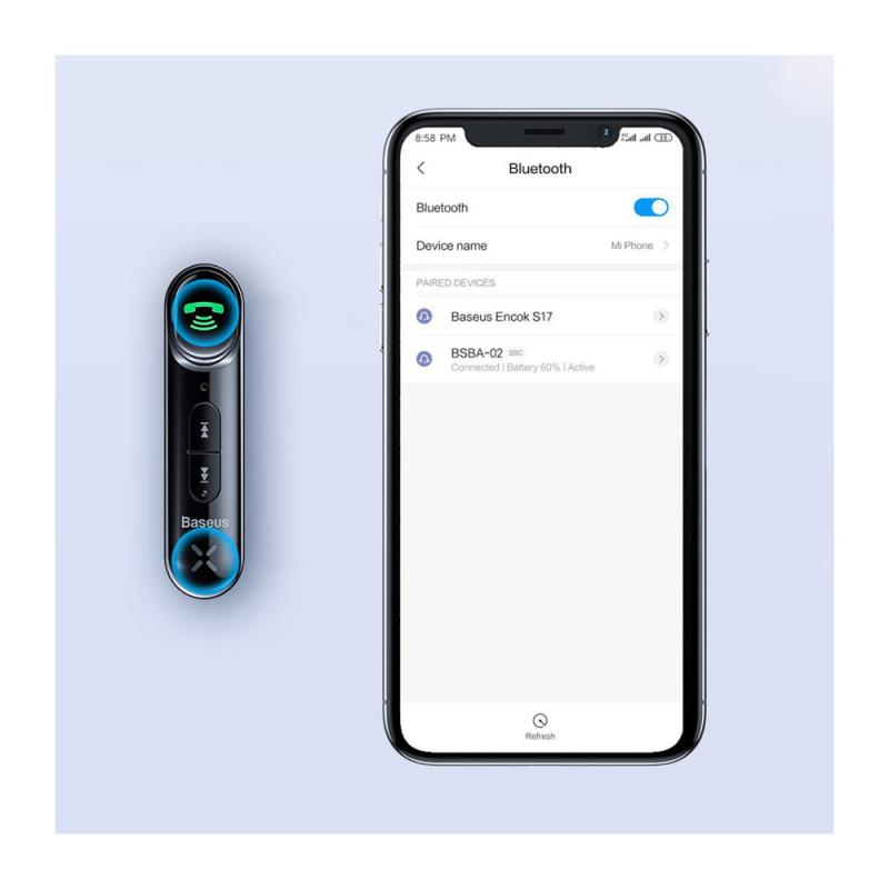 Ασύρματο Bluetooth kit αυτοκινήτου BASEUS. Το απαραίτητο gadget για το αυτοκίνητό σας. Πρόκειται για έναν ασύρματο πομπό με Bluetooth ανοιχτή ακρόαση για να πραγματοποιείτε κλήσεις handsfree και MP3 player. Μπορείτε να απαντάτε σε κλήσεις με το πάτημα ενός κουμπιού με καθαρή συνομιλία και να ακούτε μουσική προερχόμενη από το κινητό σας από τα ηχεία του αυτοκινήτου σας. Είναι εξαιρετικά ελαφρύς με ποιοτικό ήχο χωρίς απώλειες και μπορεί να συνδεθεί σε οποιαδήποτε συσκευή με είσοδο mini jack 3.5mm, όπως αυτοκίνητο, κινητά, ακουστικά, ηχεία. Μία πλήρης φόρτιση αρκεί για 10 ώρες ακρόασης.