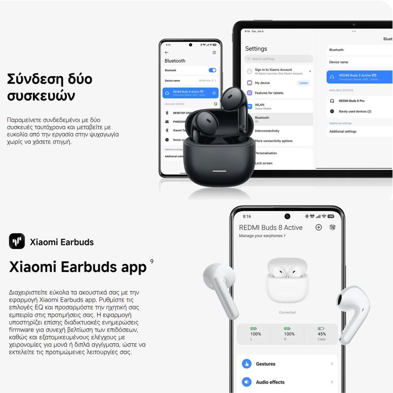 Ανακαλύψτε την απόλυτη εμπειρία ακρόασης με τα Redmi Buds 8 Active. Σχεδιασμένα για καθημερινή χρήση, συνδυάζουν κομψό design, άνετη εφαρμογή και εντυπωσιακή απόδοση ήχου, ώστε να σας συνοδεύουν παντού από τη δουλειά μέχρι τη γυμναστική και τις βόλτες σας.