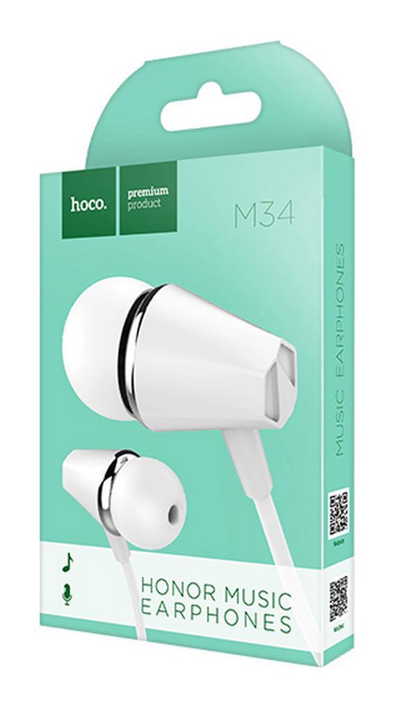 Hands Free Hoco M34 Earphones Stereo 3.5 mm Λευκό με Μικρόφωνο και Πλήκτρο Λειτουργίας μουσικής και απάντησης κλήσεων. Συμβατά με Android και iOS. Βάρος 16g.