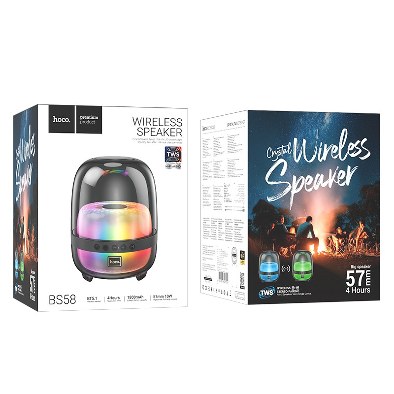 Το Hoco BS58 Crystal είναι ένα ασύρματο ηχείο με έξοδο 10W και μπαταρία 1800mAh μεγάλης διάρκειας. Διαθέτει Bluetooth 5.1 για σταθερή και αξιόπιστη σύνδεση, καθώς και θύρες USB, Micro SD και AUX για σύνδεση με άλλες συσκευές. Το ηχείο διαθέτει επίσης εφέ φωτισμού LED 360° που μπορούν να προσαρμοστούν σύμφωνα με τις προτιμήσεις σας. Επιλέξτε από ρυθμικό φως, ντεγκραντέ, φως αναπνοής, φως surround και άλλες λειτουργίες για να δημιουργήσετε μια διασκεδαστική και εορταστική ατμόσφαιρα. Το Hoco BS58 Crystal είναι μια εξαιρετική επιλογή για όποιον αναζητά ένα ισχυρό, φορητό και ευέλικτο ασύρματο ηχείο. Είναι ιδανικό για πάρτι, συγκεντρώσεις ή απλά να ακούτε μουσική στο σπίτι. Χρόνος φόρτισης: περίπου 3 ώρες. Χρόνος χρήσης: 4-5 ώρες. Βάρος: 665g