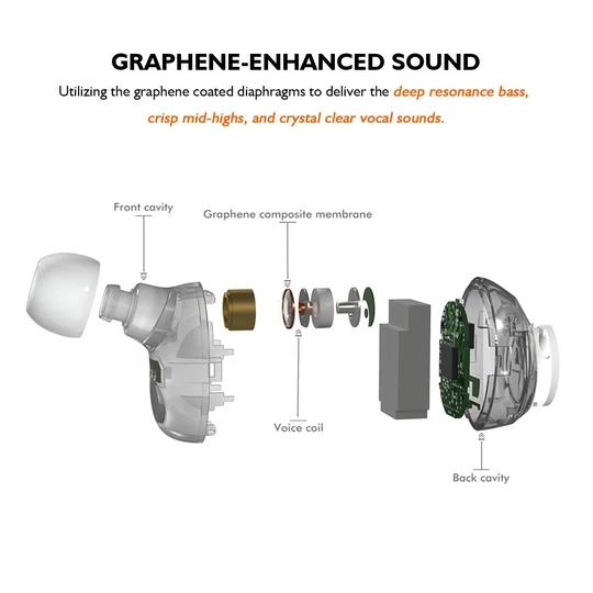 Graphene-enhanced Sound – Utilizes the Graphene for treble enchancements, noise isolation, and overall sound quality improvement.