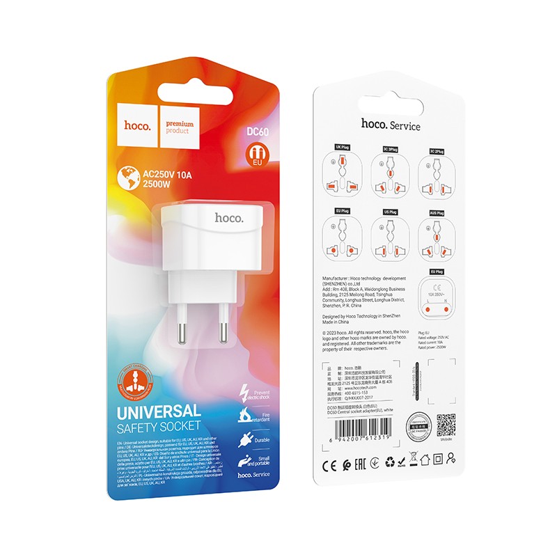 Αντάπτορας Hoco DC60 Universal (UK, 3C 3Plug, 3C 2Plug, US Plug) σε European Λευκός
