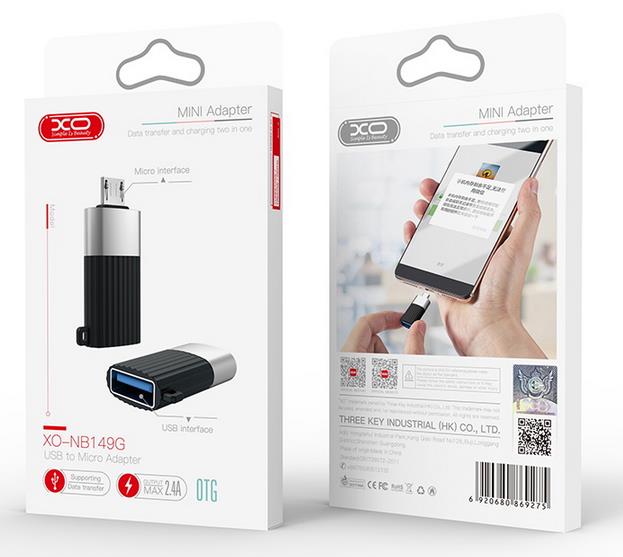 XO adapter NB 149-G adapter from a USB socket to a micro USB socket. Enables loading and data transmission. Compatible with smartphones, tablets, laptops etc. equipped with type USB connector.