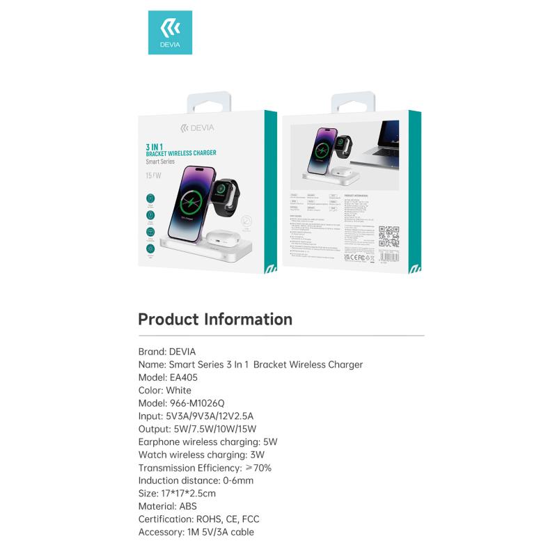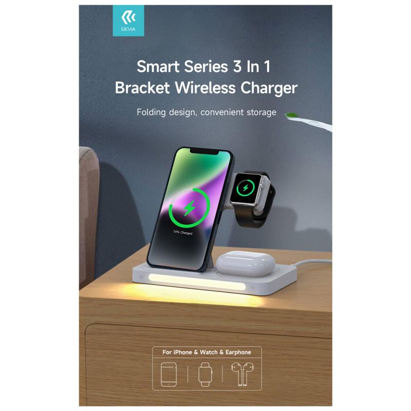 Ασύρματος Φορτιστής – Βάση με Βραχίονα 3in1 Devia EA405 15W για Apple Airpods, iPhone & iWatch Smart Λευκό