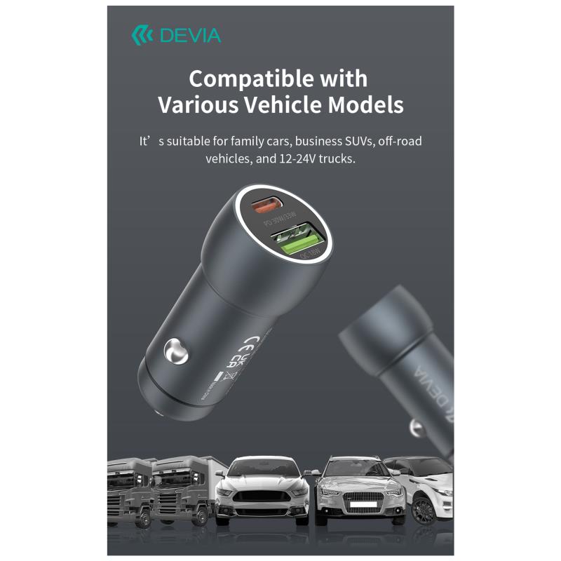 Ο Devia EA507 Metal 48W είναι ένας premium φορτιστής αυτοκινήτου σχεδιασμένος για όσους απαιτούν μέγιστη ταχύτητα και κορυφαία ποιότητα. Με διπλή έξοδο USB A & USB C, υποστηρίζει τεχνολογίες PD 30W, QC 3.0 18W, PPS 33W, καθώς και FCP/SCP, προσφέροντας γρήγορη και σταθερή φόρτιση σε όλες τις σύγχρονες συσκευές. Η μεταλλική κατασκευή του προσφέρει αντοχή και premium εμφάνιση, ενώ το μικρό του μέγεθος το κάνει ιδανικό για κάθε αυτοκίνητο. Στη συσκευασία περιλαμβάνεται και το υψηλής ποιότητας USB C σε USB C braided καλώδιο PD 60W (1m), για μέγιστη αντοχή και γρήγορη μεταφορά δεδομένων.