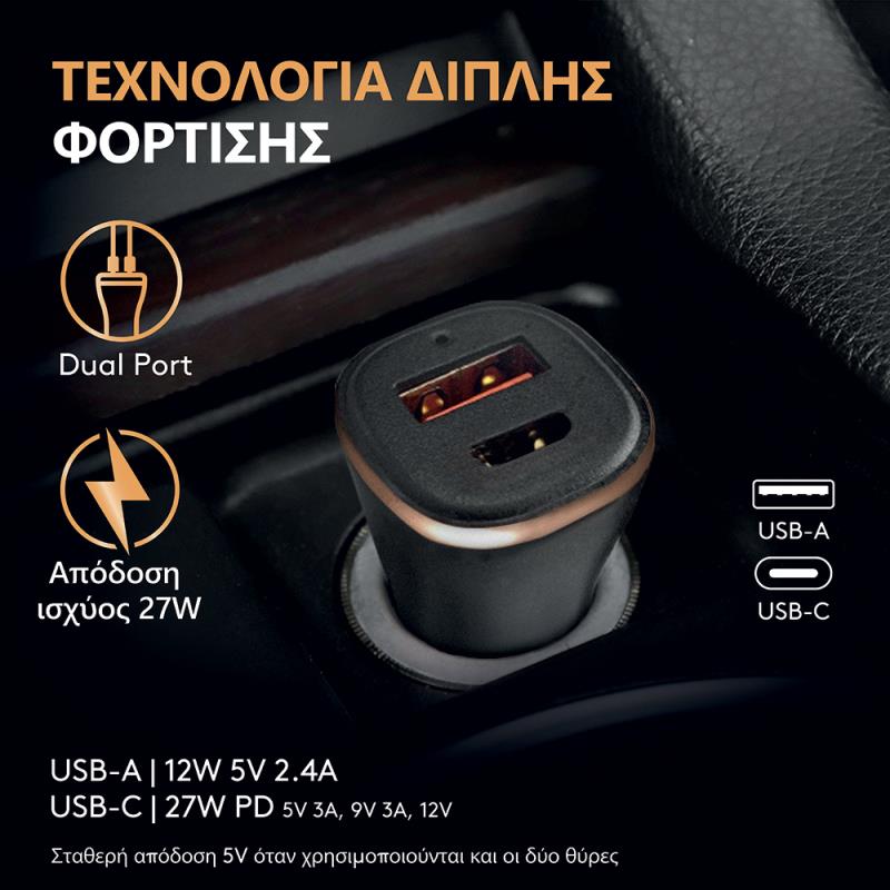 Φορτιστής Αυτοκινήτου Ταχείας Φόρτισης Duracell με Διπλή Έξοδο USB A & USB C PD 3.0 27W Μαύρο-Μπρονζέ