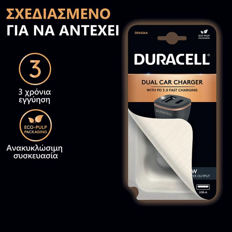 Με έναν φορτιστή DURACELL δεν θα μείνετε ποτέ ξανά από μπαταρία! Ο Φορτιστής Αυτοκινήτου Duracell με διπλή έξοδο USB A & USB C διαθέτει τεχνολογία PD και φορτίζει γρήγορα και αποτελεσματικά τις αγαπημένες σας συσκευές! Μπορείτε να φορτίστε 2 συσκευές ταυτόχρονα. O εξαιρετικός σχεδιασμός του προσφέρει απόδοση και πρακτικότητα και σας εγγυάται ότι θα φτάσετε στον προορισμό σας με γεμάτη μπαταρία! Απλά συνδέστε το καλώδιο USB στην κατάλληλη υποδοχή και τοποθετήστε τον στον αναπτήρα του αυτοκινήτου σας. Οι φορτιστές Duracell είναι συσκευασμένοι από 100% ανακυκλώσιμα υλικά και κατασκευασμένοι από υλικά υψηλής ποιότητας για να αντέχουν.