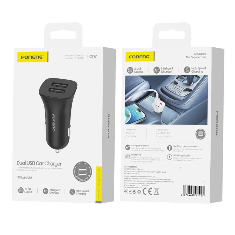Ο φορτιστής αυτοκινήτου Foneng C07 Dual-USB 2.4 A, είναι μια πρακτική λύση φόρτισης εν κινήσει. Σχεδιασμένο με δύο θύρες USB A που παρέχουν έως 5V/2.4A η καθεμία, φορτίζει ταυτόχρονα smartphone, tablet, φωτογραφικές μηχανές και άλλα. Εξοπλισμένο με έξυπνο τσιπ, αναγνωρίζει με ευφυή τρόπο τις συνδεδεμένες συσκευές και βελτιστοποιεί την ταχύτητα φόρτισης, διατηρώντας παράλληλα σταθερή και ανθεκτική απόδοση. Το κομψό περίβλημα ABS προσφέρει μια εξαιρετική αίσθηση απαλής αφής σε μαύρο ή λευκό χρώμα και ταιριάζει σε πρίζες αυτοκινήτου ή φορτηγού 12-24V.
