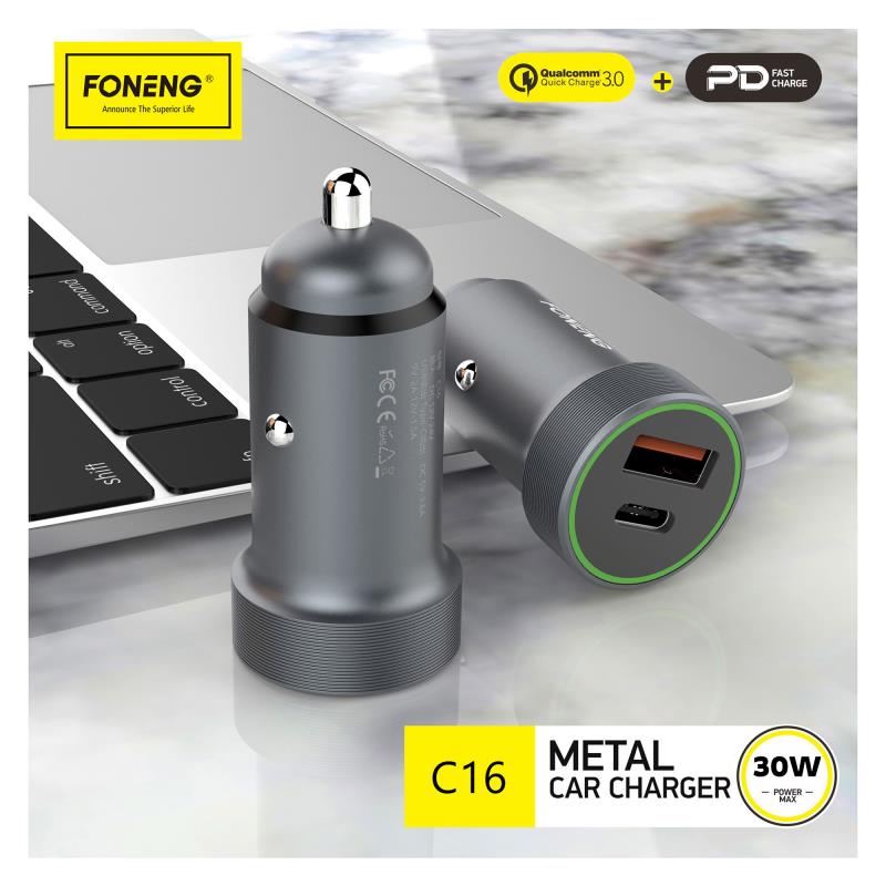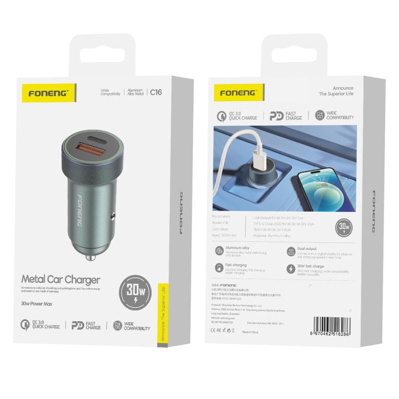 Φορτιστής Αυτοκινήτου Ταχείας Φόρτισης Foneng C16 με Διπλή Έξοδο USB A & USB C 30W Γκρι