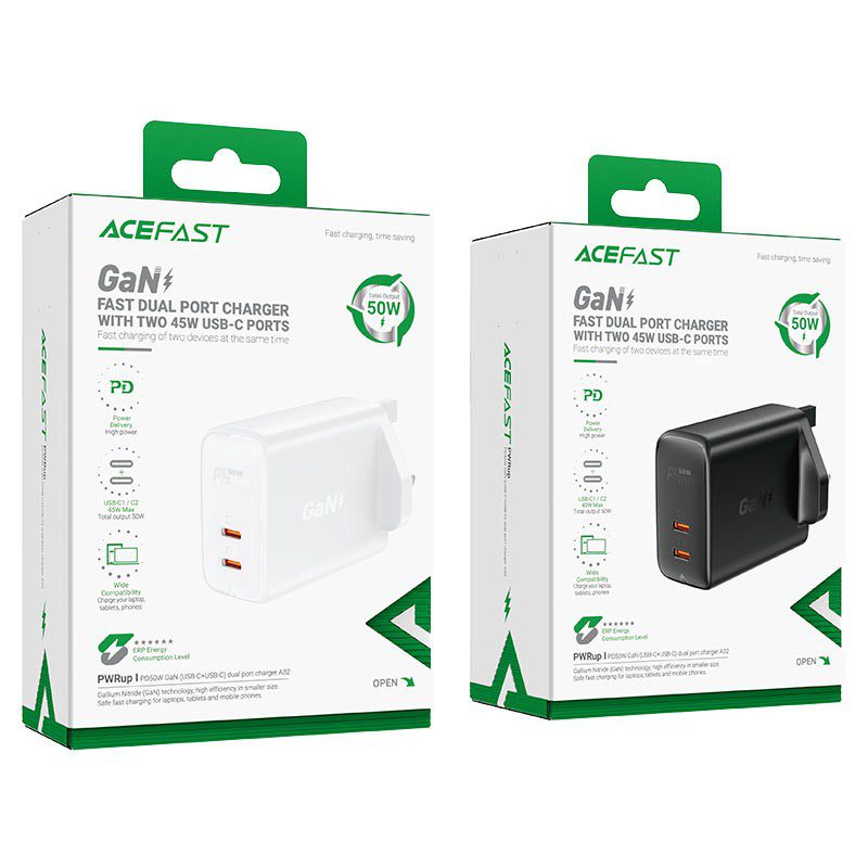 Φορτιστής Ταξιδίου Acefast A32 Fast Charging 2xUSB-C PD50W GaN με UK Plug. Υποστηρίζει PD50W, AFC, FCP και άλλα πρωτόκολλα φόρτισης. Με GaN για σταθερή φόρτιση, ταχύτερη ψύξη και μικρότερο μέγεθος. Συμβατός με το 99% ψηφιακών συσκευών φόρτισης USB. Είναι φτιαγμένος από επιβραδυντικό φλόγας, στιβαρό και ανθεκτικό για προστασία πολλαπλών κυκλωμάτων. Είναι κυρίως κατάλληλο για γρήγορη φόρτιση PD για iPhone ή κινητό τηλέφωνο Samsung, για iPad και άλλες συσκευές. Έξοδοι: 2xUSB-C.