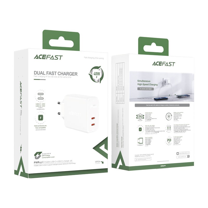 Φορτιστής Ταξιδίου Acefast A9 Fast Charging USB-C QC3.0 / QC2.0 PD40W Λευκός. Έξυπνη έξοδος, υποστήριξη για PD20W, QC3.0 / QC2.0, AFC, FCP και άλλα πρωτόκολλα φόρτισης. Συμβατό με το 99% των ψηφιακών συσκευών φόρτισης USB. Είναι φτιαγμένος από υλικό επιβραδυντικό φλόγας, στιβαρό και ανθεκτικό, προστασίας πολλαπλών κυκλωμάτων. Ασφαλέστερος με πυροπροστασία V0 και πιστοποίηση ενεργειακής απόδοσης PSE, 3C, ERP6. Υποστηρίζει ταυτόχρονα γρήγορη φόρτιση διπλής θύρας USB-C, γρήγορη φόρτιση PD για τηλέφωνο Apple και μοντέλο τηλεφώνου Samsung ταυτόχρονα και υποστήριξη γρήγορης φόρτισης PD για τηλέφωνο Apple και για iPad ταυτόχρονα. Διαστάσεις: 98.9×28.9×53.6mm. Είσοδος: AC 100-240V, 0.6A, 50/60Hz. Έξοδος: USB-C1 PD 3.0: DC 5V / 2.4A, 9V / 2.22A, 12V / 1.67A, 20W. USB-C2: PD 3.0: DC 5V / 2.4A, 9V / 2.22A, 12V / 1.67A, 20W. Συνολική έξοδος: 20W + 20W = 40W.