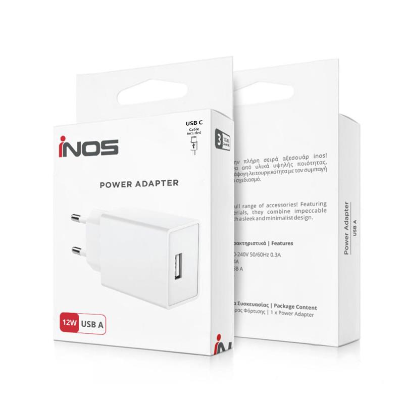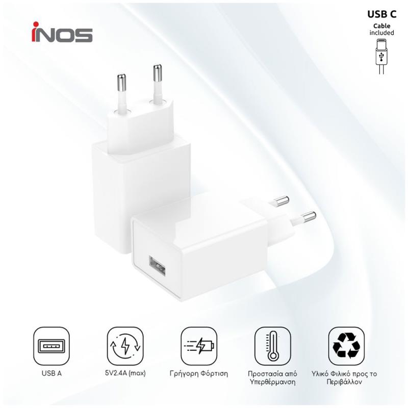 Φορτιστής Ταξιδίου inos με Έξοδο USB A 12W & USB C Καλώδιο 1m Λευκό