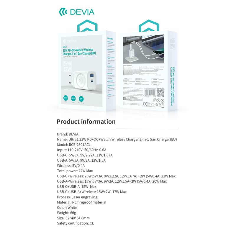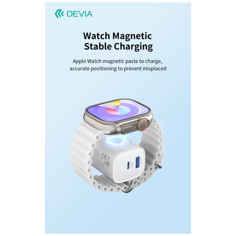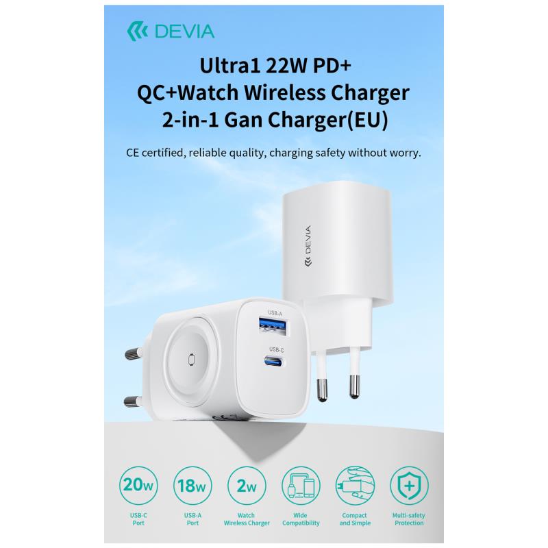 Φορτιστής Ταξιδίου Ταχείας Φόρτισης & Ασύρματος για Watch 2 σε 1 Devia RCE-2301ACL με Διπλή Έξοδο USB A & USB C GaN PD QC 22W Ultra1 Λευκό