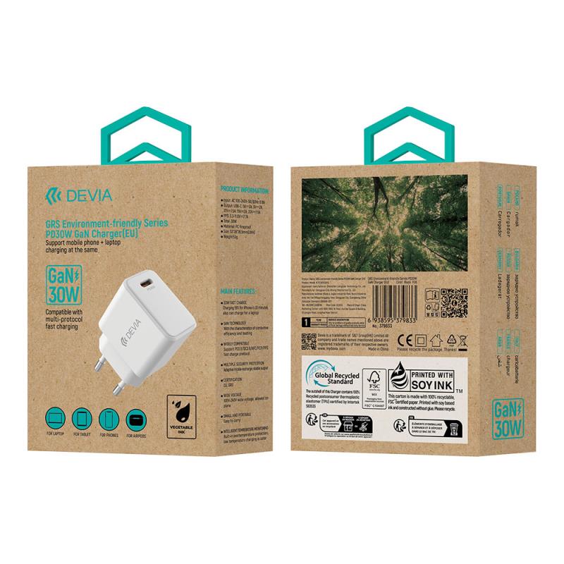 Ο φορτιστής ταξιδίου ταχείας φόρτισης Devia EA455 με Έξοδο USB C GaN PD 30W GRS είναι ένας πανίσχυρος φορτιστής που παρέχει δυνατότητα ταχείας φόρτιση. Με δυνατότητα παροχής ισχύος 30W και τεχνολογίες PD & GaN, προσφέρει ταχύτερη και αποτελεσματικότερη φόρτιση σε σχέση με τους απλούς φορτιστές, για κάθε συσκευή που υποστηρίζει ταχεία φόρτιση. Φορτίσετε τις συσκευές αλλά και τα gadgets σας εύκολα και γρήγορα και απολαύστε τα πλεονεκτήματα της γρήγορης και αποδοτικής φόρτισης! Παρέχει προστασία από υπερθέρμανση, υπερφόρτιση, υπερβολική τάση και βραχυκύκλωμα.