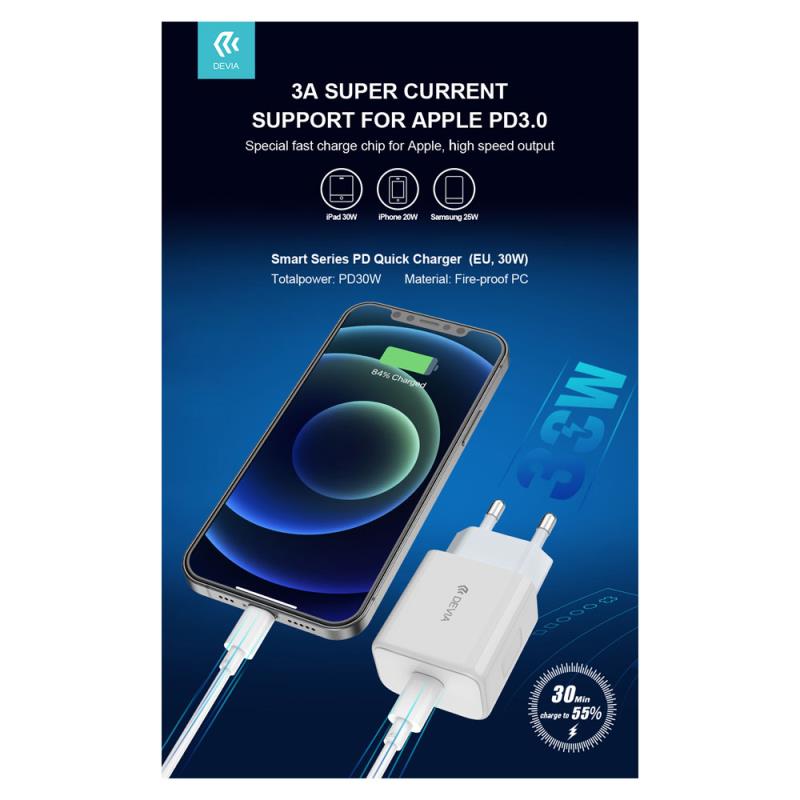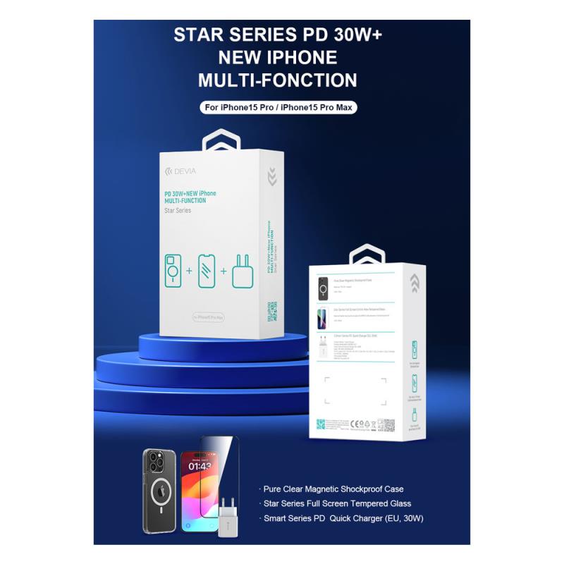 Φορτιστής Ταξιδίου Ταχείας Φόρτισης Devia με Έξοδο USB C PD 30W & Θήκη ShockProof & Tempered Glass Apple iPhone 15 Pro Max Star Pack Λευκό