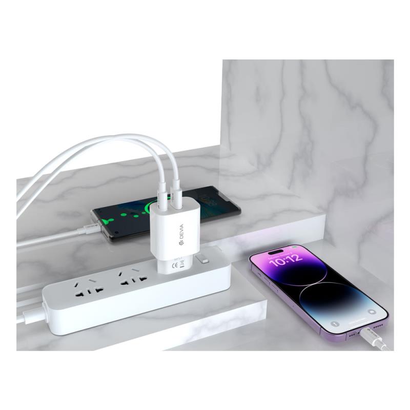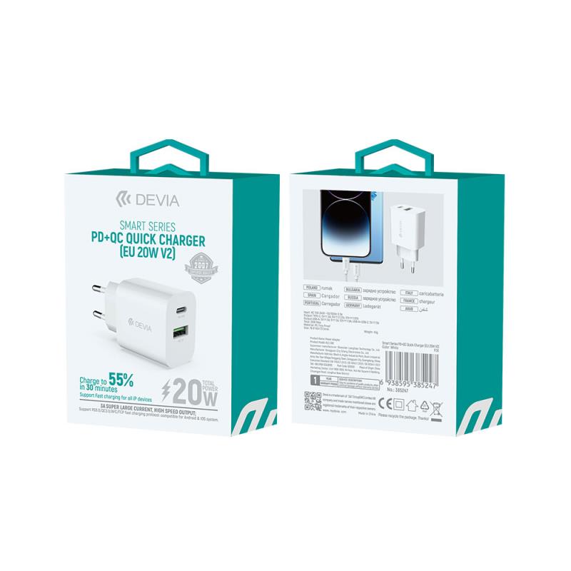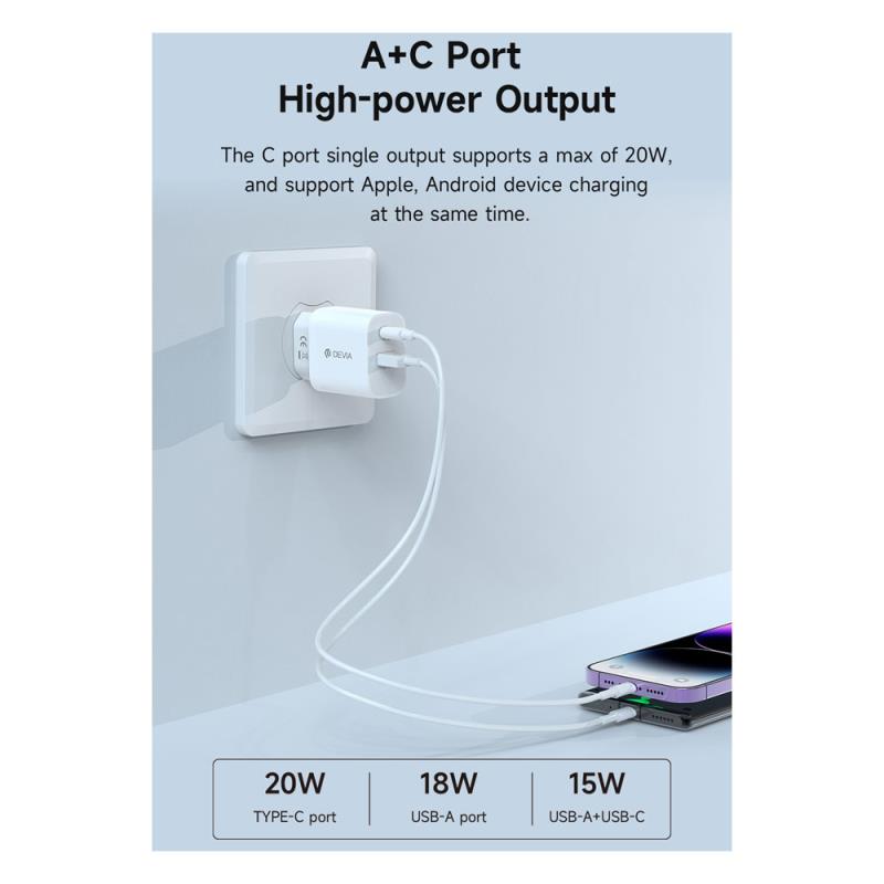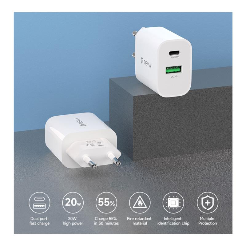 Φορτιστής ταξιδίου ταχείας φόρτισης Devia 20W με 2 εξόδους USB A & USB C PD + QC 20W. Πρόκειται για έναν πανίσχυρο φορτιστή που παρέχει την δυνατότητα ταχείας φόρτισης και στις 2 εξόδους USB που διαθέτει! Εξοπλισμένος με ισχύ 20W και τεχνολογίες PD & QC προσφέρει ταχύτερη και αποτελεσματικότερη φόρτιση σε σχέση με τους απλούς φορτιστές, για κάθε συσκευή που υποστηρίζει ταχεία φόρτιση. Φορτίσετε τις συσκευές αλλά και τα gadgets σας εύκολα και γρήγορα και απολαύστε τα πλεονεκτήματα της γρήγορης και αποδοτικής φόρτισης! Παρέχει προστασία από υπερθέρμανση, υπερφόρτιση, υπερβολική τάση και βραχυκύκλωμα.
