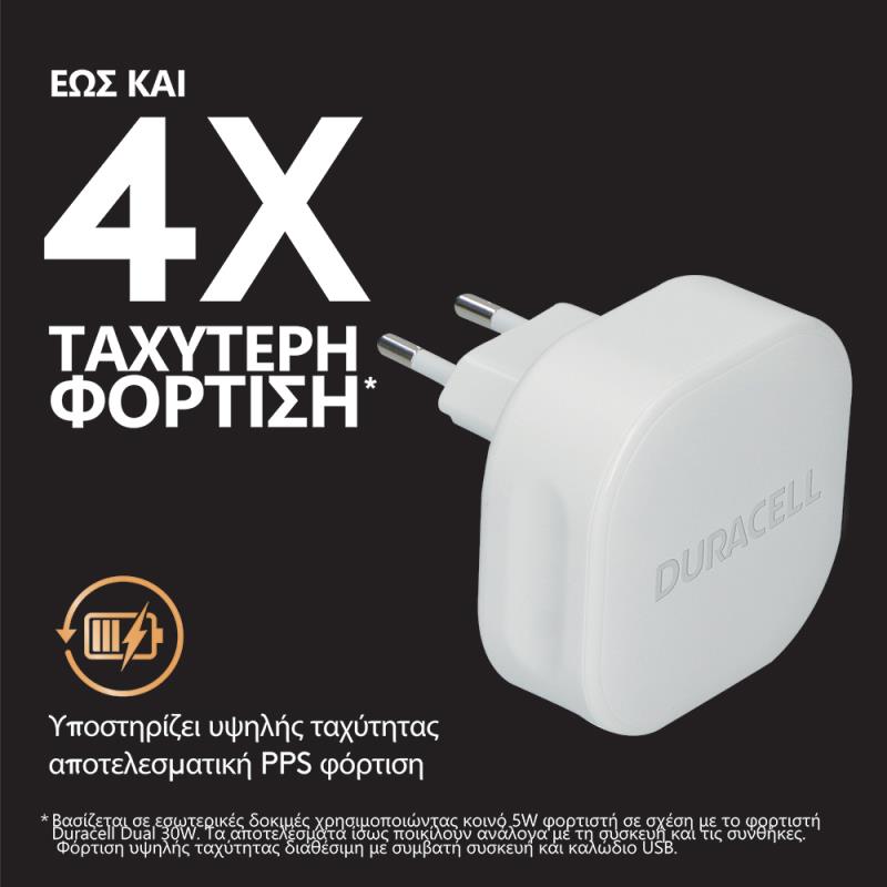 Φορτίστε ταυτόχρονα δύο συσκευές 4 φορές πιο γρήγορα με τον φορτιστή PPS 30W USB-A + USB-C της Duracell. Παρέχει εξαιρετικά γρήγορη, ασφαλή και αποτελεσματική φόρτιση δύο συσκευών ταυτόχρονα. Είτε βρίσκεστε στο σπίτι, στο γραφείο ή εν κινήσει, το γρήγορος φορτιστής είναι ιδανικός για να έχετε ενεργοποιημένες τις αγαπημένες συσκευές.