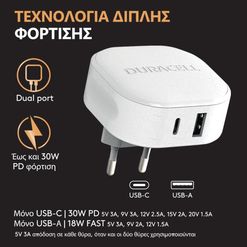 Φορτιστής Ταξιδίου Ταχείας Φόρτισης Duracell με Διπλή Έξοδο USB A & USB C PD 30W Λευκό