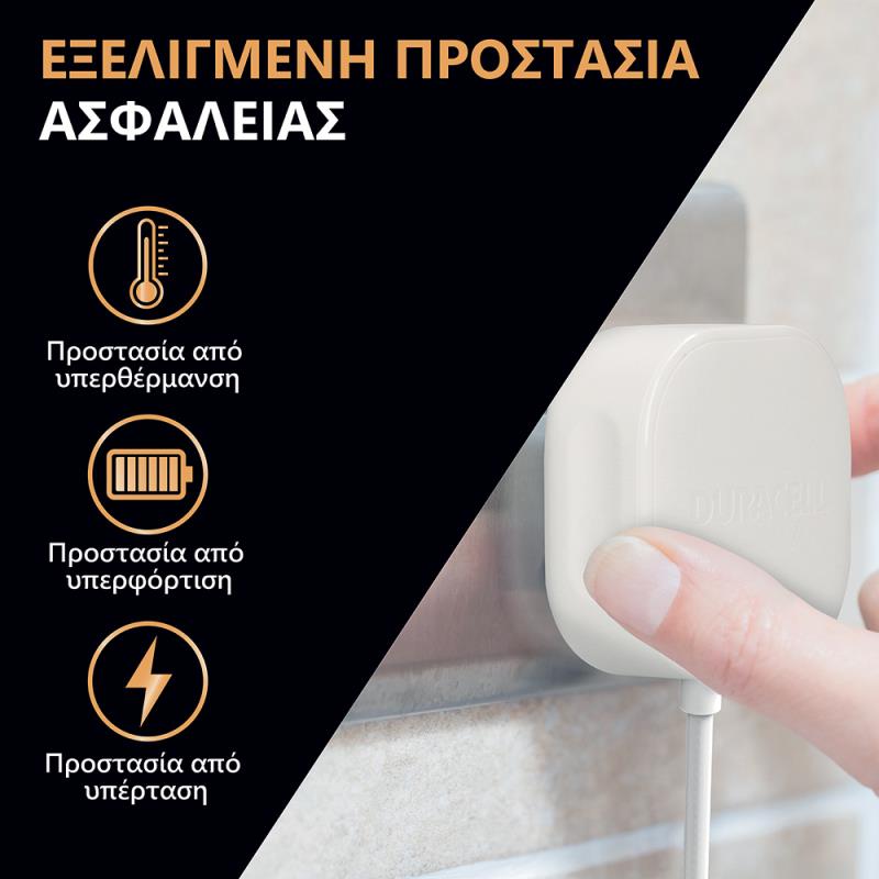 Ο λεπτός εργονομικός σχεδιασμός εξοικονομεί χώρο, ενώ τα υλικά μαλακής αφής παρέχουν ασφαλές κράτημα καθώς συνδέετε και αποσυνδέετε τον φορτιστή σας. Οι φορτιστές της Duracell έρχονται συσκευασμένοι σε οικολογική συσκευασία πεπιεσμένου πολτού που είναι 100% ανακυκλώσιμη. Κατασκευασμένος με χρήση εξαιρετικά ανθεκτικών υλικών, ο φορτιστής σχεδιαστεί για να διαρκεί περισσότερο και συνοδεύεται από 3 χρόνια εγγύηση στάνταρ.