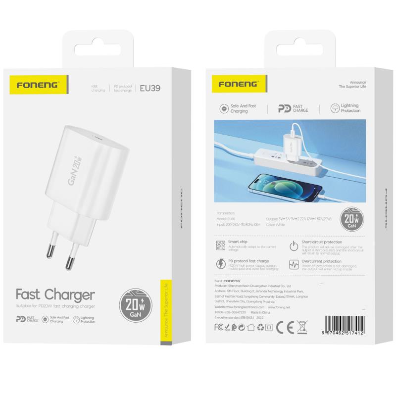 Φορτιστής Ταξιδίου Ταχείας Φόρτισης Foneng EU39 με Έξοδο USB C GaN PD 20W 3A Λευκό