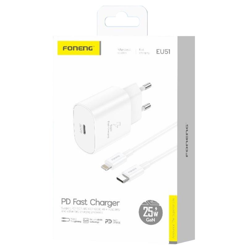 Φορτιστής Ταξιδίου Ταχείας Φόρτισης Foneng EU51 με Έξοδο USB C GaN 25W 3A & Καλώδιο USB C σε Lightning 1m Λευκό