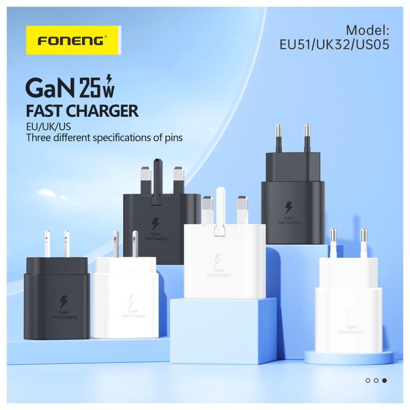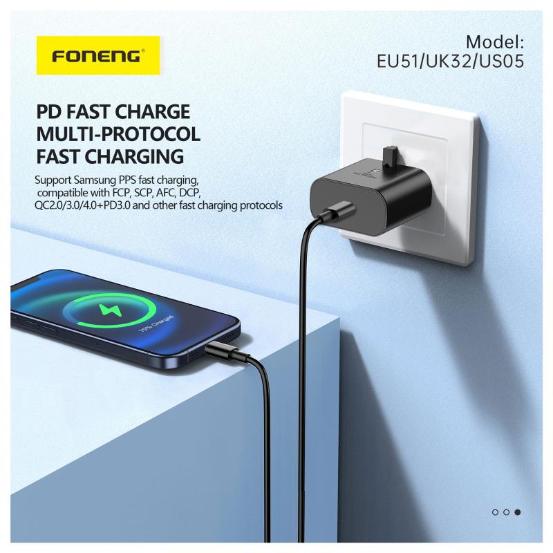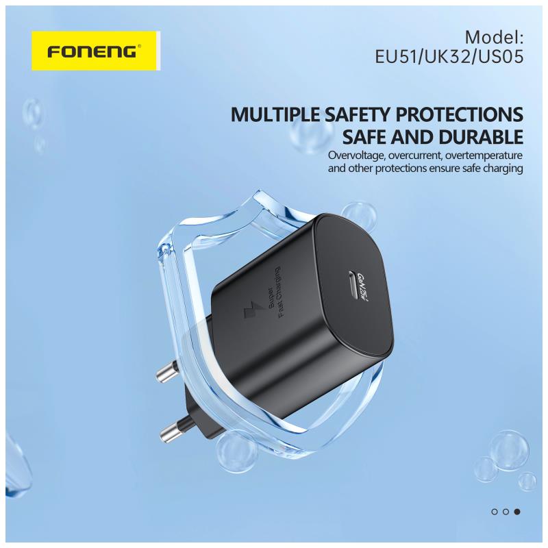 Φορτιστής Ταξιδίου Ταχείας Φόρτισης Foneng EU51 με Έξοδο USB C GaN 25W 3A & Καλώδιο USB C σε USB C 1m Μαύρο