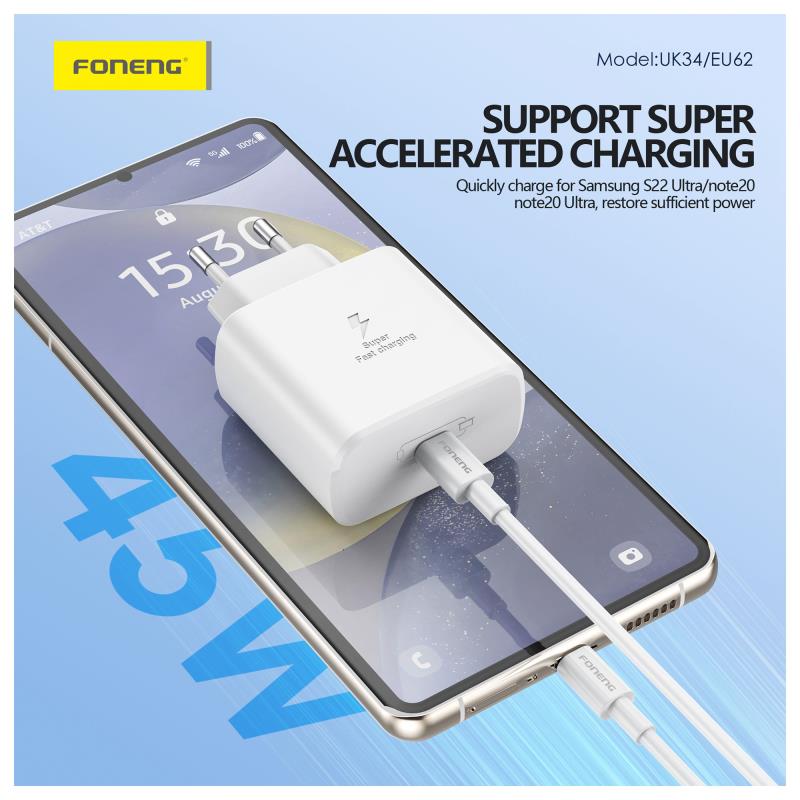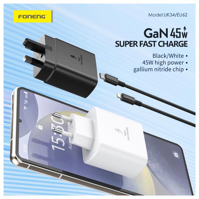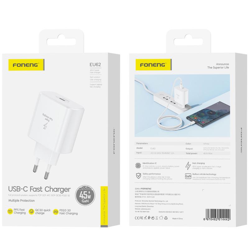Φορτιστής Ταξιδίου Ταχείας Φόρτισης Foneng EU62 με Έξοδο USB C GaN 45W 3A Λευκό