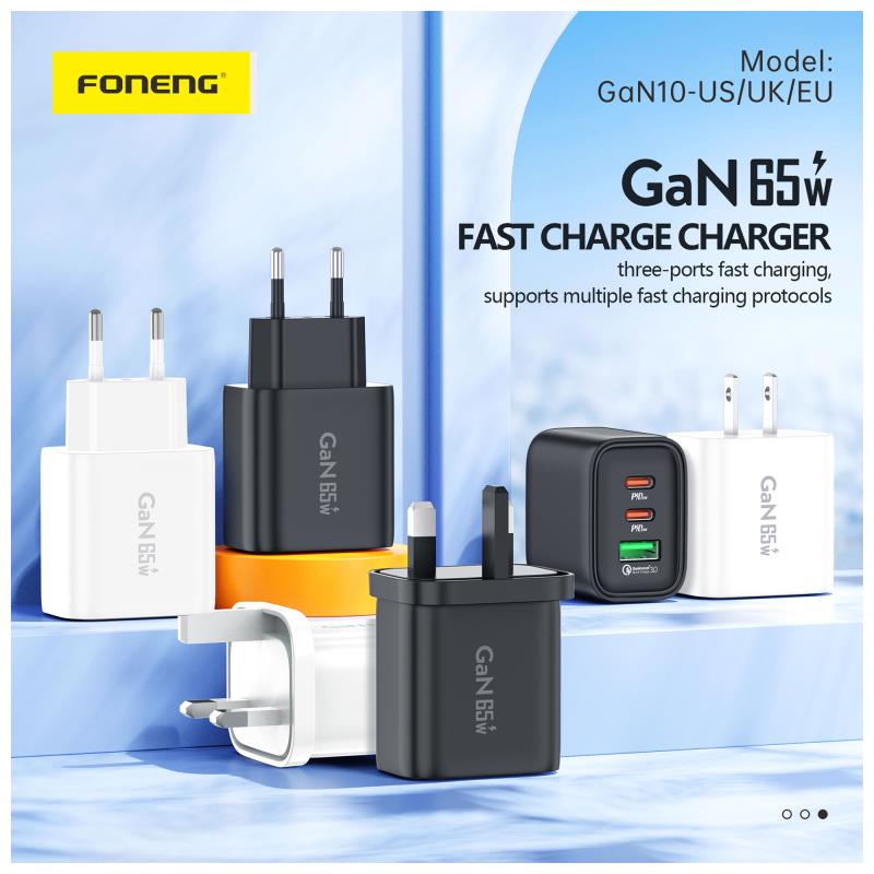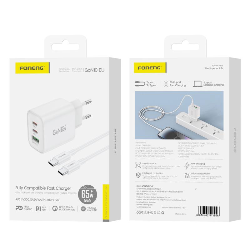 Φορτιστής Ταξιδίου Ταχείας Φόρτισης Foneng GaN10-EU με Τριπλή Έξοδο USB A & 2xUSB C GaN 65W & Καλώδιο USB C σε USB C 1m Λευκό
