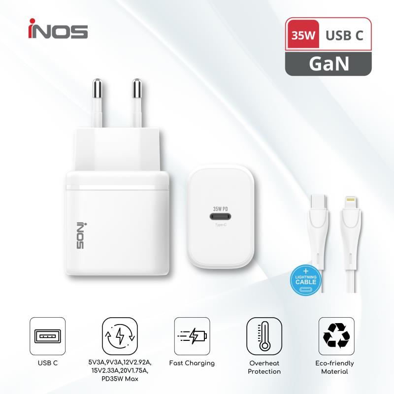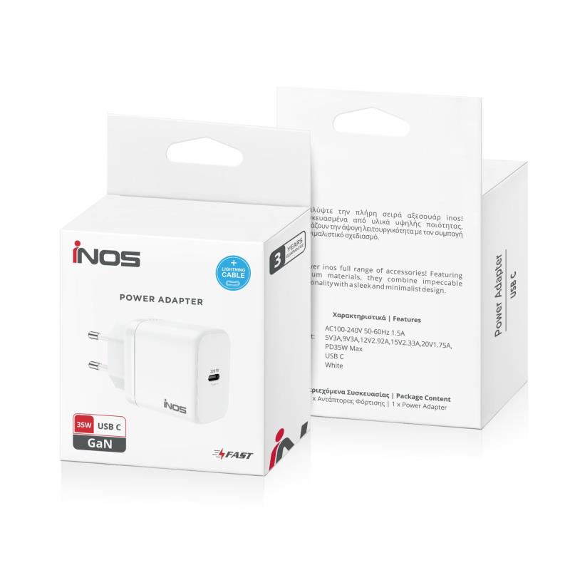 Φορτιστής Ταξιδίου Ταχείας Φόρτισης inos με Έξοδο USB C GaN PD QC 3.0 35W & Lightning Καλώδιο 1m Λευκό
