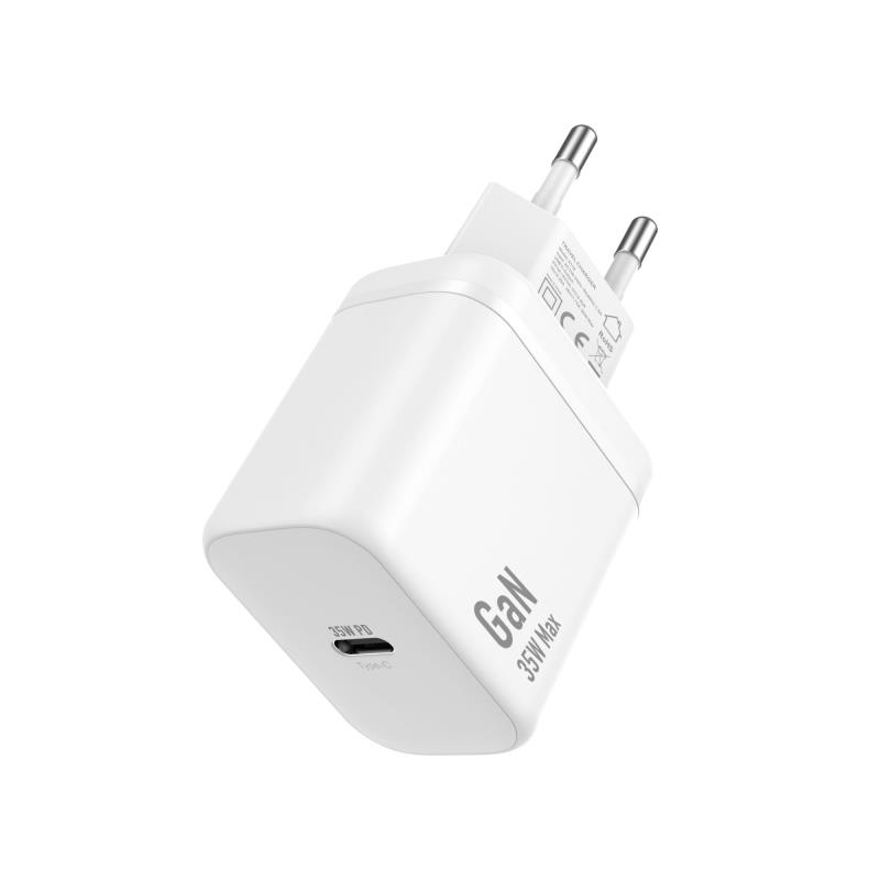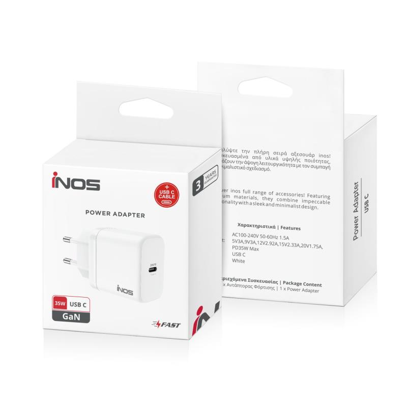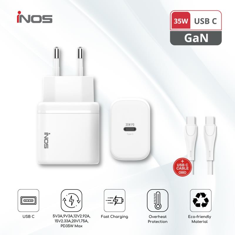 Φορτιστής Ταξιδίου Ταχείας Φόρτισης inos με Έξοδο USB C GaN PD QC 3.0 35W & USB C Καλώδιο 1m Λευκό