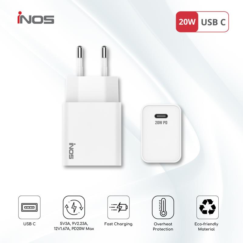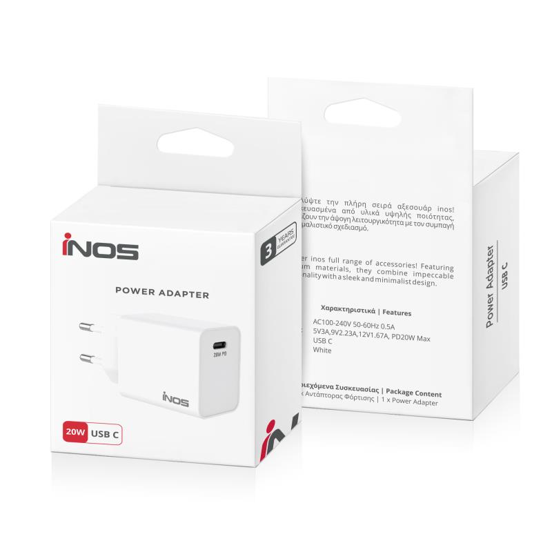 Φορτιστής Ταξιδίου Ταχείας Φόρτισης inos με Έξοδο USB C PD 20W Λευκό