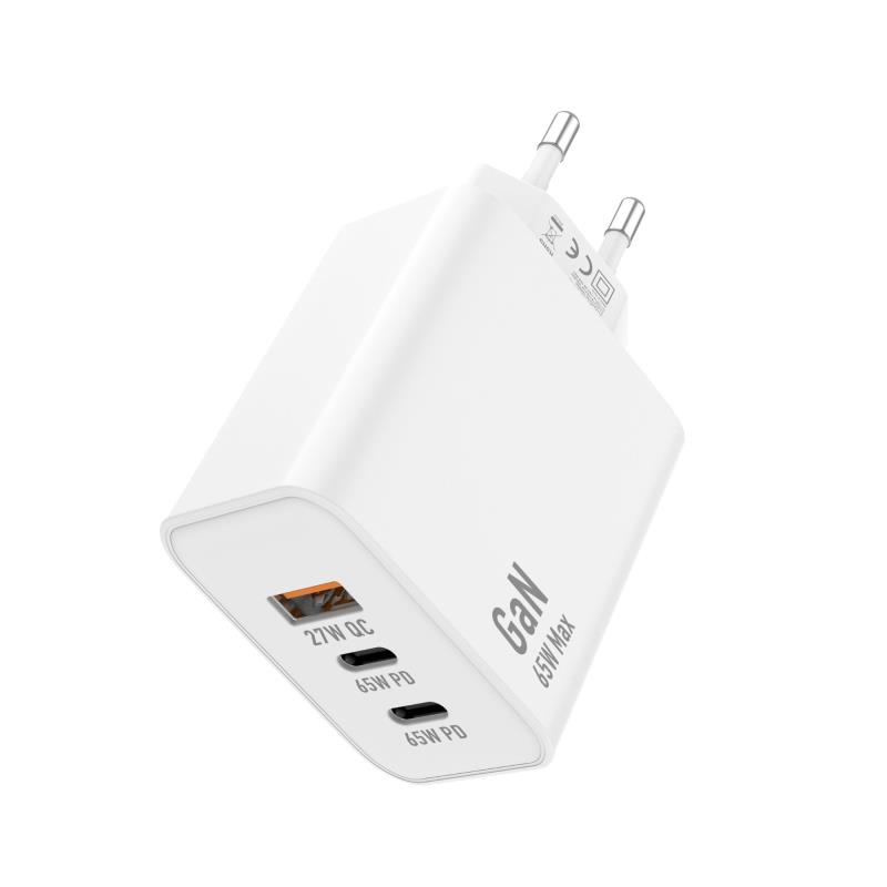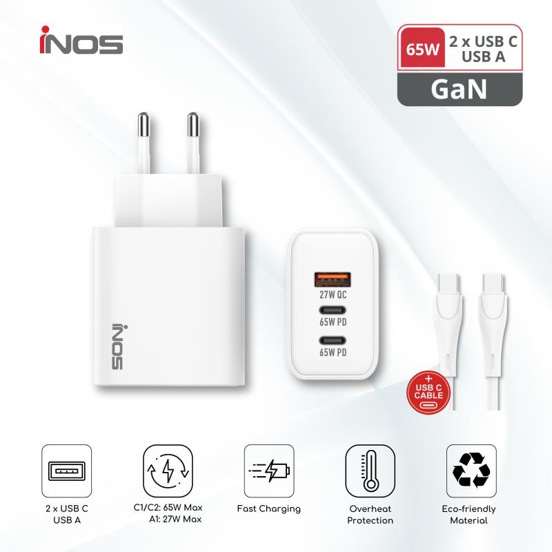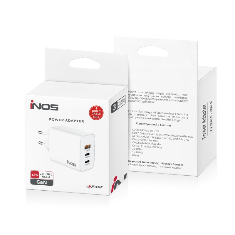 Φορτιστής Ταξιδίου Ταχείας Φόρτισης inos με Τριπλή Έξοδο USB A & 2xUSB C GaN PD QC 3.0 65W & USB C Καλώδιο 1m Λευκό