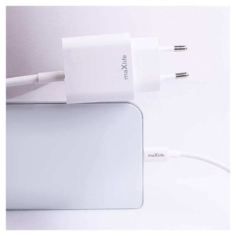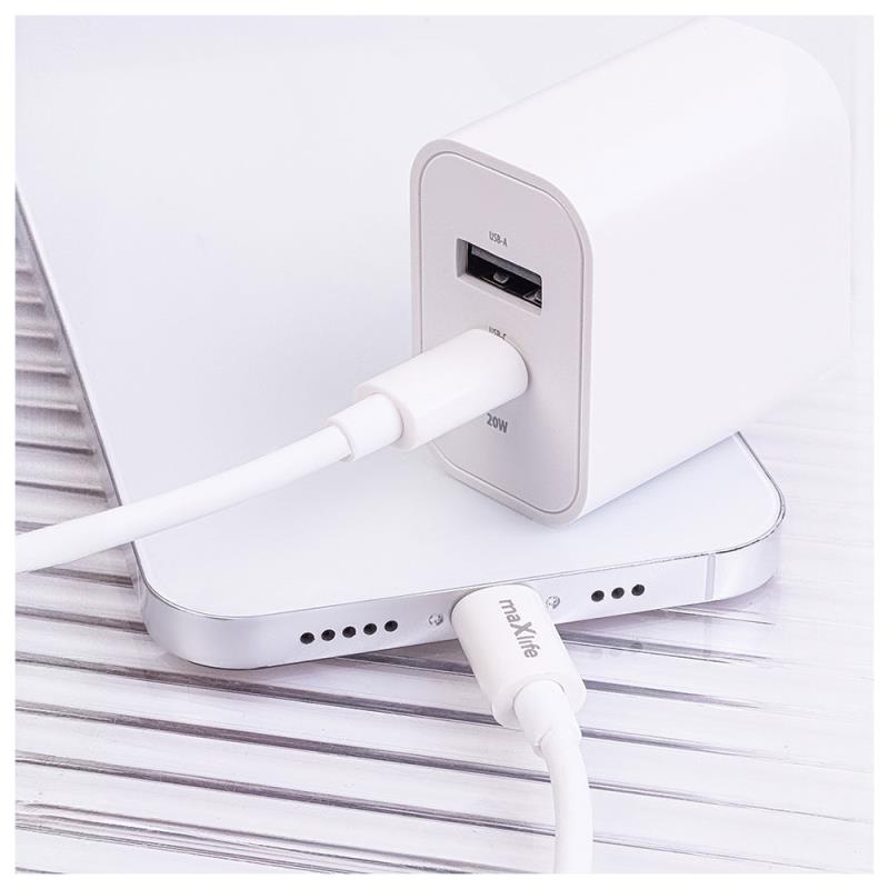 Φορτιστής Ταξιδίου Ταχείας Φόρτισης Maxlife MXTC-06-20AC με Διπλή Έξοδο USB A & USB C 20W & Καλώδιο USB C σε Lightning 1m Λευκό