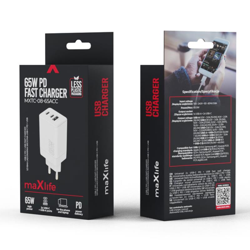 Ο φορτιστής Maxlife MXTC-08-65ACC PD QC παρέχει εξαιρετική απόδοση φόρτισης με ισχυρή έξοδο 65W. Εξοπλισμένος με δύο θύρες USB C PD και μία USB A QC, σας επιτρέπει να φορτίζετε ταυτόχρονα πολλές συσκευές. Σχεδιασμένος για αποδοτικότητα και ασφάλεια, διαθέτει έξυπνη κατανομή ισχύος για τη βελτιστοποίηση της ταχύτητας φόρτισης, ενώ προστατεύει τις συσκευές σας από υπερθέρμανση και υπερφόρτιση. Η κατασκευή του τον καθιστά ιδανικό για ταξίδια ή καθημερινή χρήση.