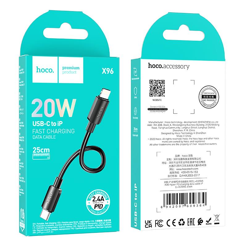HOCO X96 ΚΑΛΩΔΙΟ ΜΕΤΑΦΟΡΑΣ ΔΕΔΟΜΕΝΩΝ HYPER PD ΣΕ LIGHTNING,0.25m, ΜΑΥΡΟ