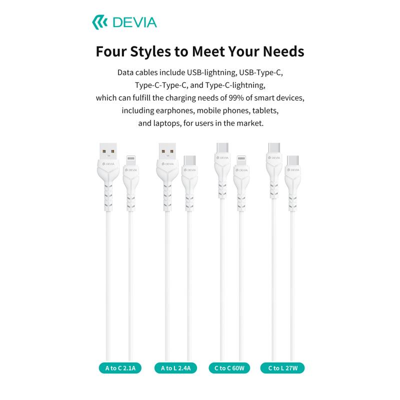 Τα καλώδια Devia, προσφέρουν γρήγορη φόρτιση και ασφαλή μεταφορά δεδομένων. Κατασκευασμένα από υψηλής ποιότητας eco-friendly υλικό, παρέχουν μέγιστη ανθεκτικότητα στην κατηγορία τους ενώ διαθέτουν μοντέρνο και προσεγμένο σχεδιασμό! Εξασφαλίζει ασφαλή φόρτιση ισχύος 2.1A, άμεση φόρτιση για την συσκευή σας με θύρα USB C.