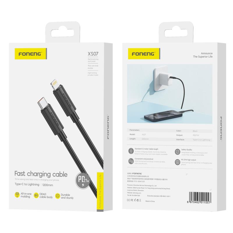 Το καλώδιο σύνδεσης Foneng XS07 USB 2.0 συνδυάζει σύγχρονη τεχνολογία, αξιόπιστη απόδοση και πρακτικό σχεδιασμό, αποτελώντας ιδανική επιλογή για καθημερινή φόρτιση και χρήση των συσκευών σας. Διαθέτει σύνδεση USB C σε Lightning, προσφέροντας γρήγορη και σταθερή φόρτιση. Το μήκος 1,2 μέτρων προσφέρει μεγαλύτερη άνεση στη χρήση, ενώ η ποιοτική κατασκευή του εξασφαλίζει αντοχή στη φθορά και μακροχρόνια αξιοπιστία. Παράλληλα, εγγυάται ασφαλή και σταθερή λειτουργία, καλύπτοντας τις ανάγκες της καθημερινότητας με απλότητα και αποτελεσματικότητα.
