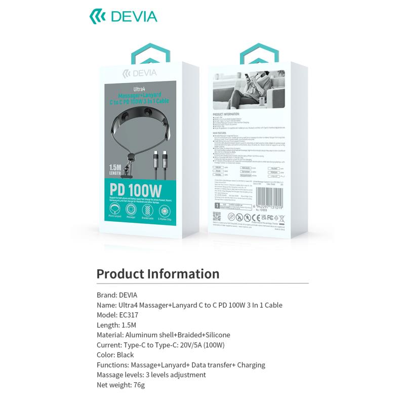 Καλώδιο Σύνδεσης USB 2.0 Massager Lanyard 3 σε 1 Braided Devia EC317 USB C σε USB C PD 100W 1.5m Ultra4 Μαύρο