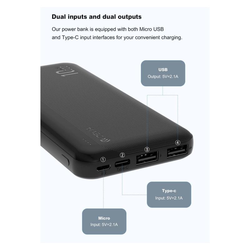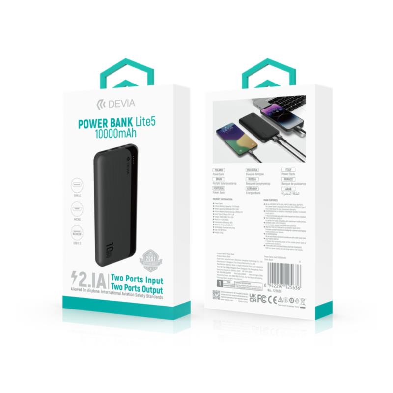 Το Power Bank Devia Lite5 10000mAh προσφέρει αξιόπιστη και γρήγορη φόρτιση για τις συσκευές σας, όπου κι αν βρίσκεστε, ενώ ο λεπτός, ελαφρύς σχεδιασμός το καθιστά ιδανικό για ταξίδια και καθημερινή χρήση. Με δύο εξόδους USB A και δύο εισόδους USB C και Micro USB, υποστηρίζει φόρτιση 2 συσκευών ταυτόχρονα. Κατασκευασμένο από ανθεκτικό, πυρίμαχο πλαστικό για ασφάλεια και αντοχή.