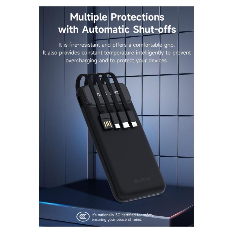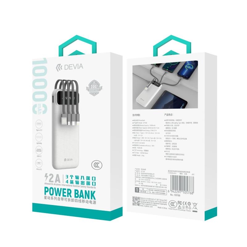To powerbank της Devia EP189 10W 10000mAh διαθέτει 4 ενσωματωμένα καλώδια USB Α, Micro USB, USB C και Lightning, καθώς και θύρες USB C, micro USB και USB A. Διαθέτει συμπαγή και ελαφρύ σχεδιασμό, ώστε να το έχετε παντού μαζί σας, ενώ το περίβλημά του είναι ανθεκτικό στις υψηλές θερμοκρασίες και τις πτώσεις. Είναι εγκεκριμένο για χρήση σε αεροπλάνο, ενώ διαθέτει και οθόνη ένδειξης του επιπέδου μπαταρίας, ώστε να γνωρίζετε πάντα το επίπεδό της. Επιπλέον, παρέχει προστασία από υπερθέρμανση, υπερτροφοδότηση και βραχυκύκλωμα.
