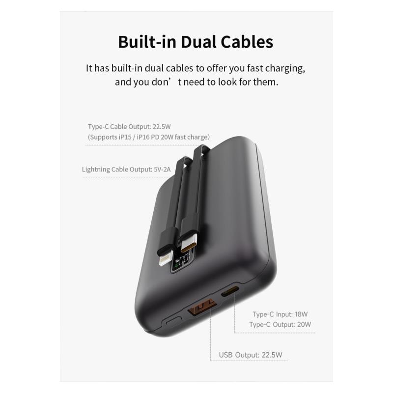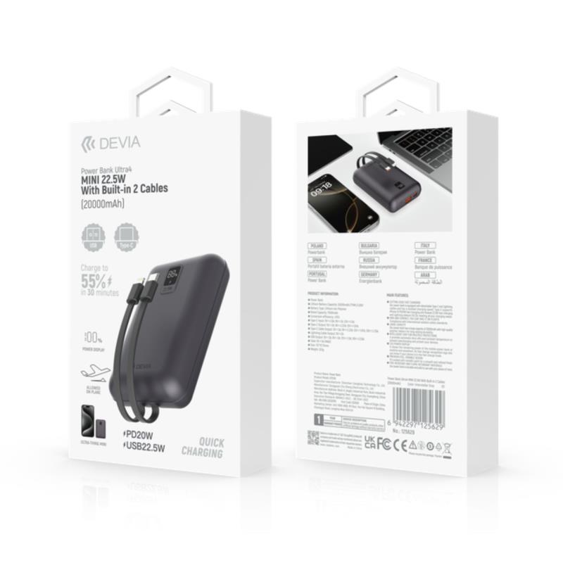 Το Devia EP208 MINI είναι ένα ισχυρό Powerbank χωρητικότητας 20000mAh που υποστηρίζει ταχεία φόρτιση έως 22.5W. Διαθέτει δύο ενσωματωμένα καλώδια (Type-C και Lightning), ώστε να φορτίζετε τις συσκευές σας χωρίς επιπλέον καλώδια. Περιλαμβάνει επίσης θύρες USB και Type-C. Είναι εγκεκριμένο για μεταφορά σε αεροπλάνο, ενώ το περίβλημά του είναι σχεδιασμένο για υψηλή αντοχή σε πτώσεις και θερμότητα. Διαθέτει LED οθόνη με ένδειξη επιπέδου μπαταρίας και παρέχει πλήρη προστασία από υπερφόρτιση, υπερθέρμανση και βραχυκύκλωμα.