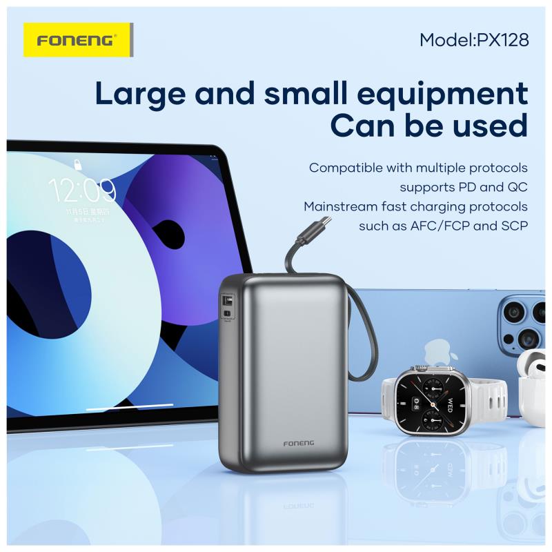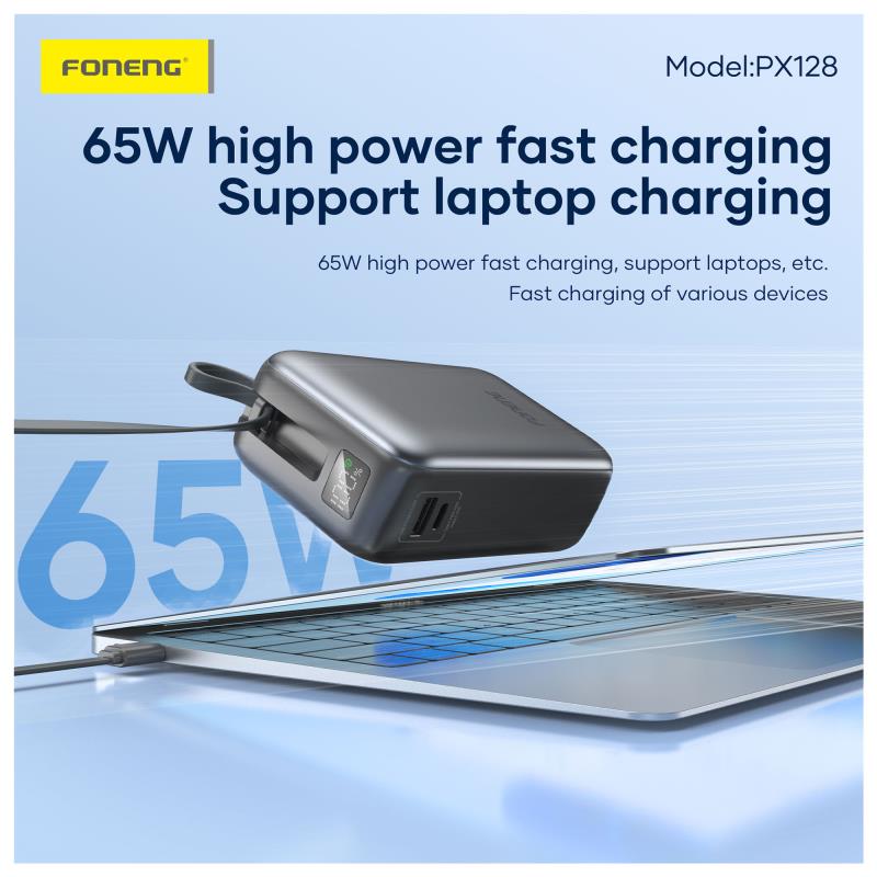 Το Foneng PX128 είναι ένα power bank 30000 mAh σχεδιασμένο για αξιόπιστη γρήγορη φόρτιση έως 65W. Διαθέτει τρεις θύρες εξόδου (USB A, θύρα USB C, καλώδιο USB C) και υποστηρίζει είσοδο μέσω θύρας USB C και καλωδίου. Μια ενσωματωμένη οθόνη LCD δείχνει το υπόλοιπο ποσοστό της μπαταρίας. Με διαστάσεις περίπου 110.0×70.0x37.0 mm και βάρος περίπου 480g, είναι συμπαγές και εύκολο στη μεταφορά για την χωρητικότητά του.