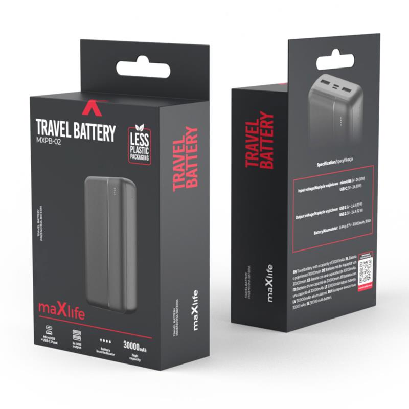 Power bank της Maxlife με 30000 mAh. Διαθέτει 2 εξόδους USB για να μπορείτε να φορτίζετε τις συσκευές σας ταυτόχρονα. Υψηλής ποιότητας σύγχρονες κυψέλες Li-Poly παρέχουν πολλούς κύκλους φόρτισης. Το εξωτερικό περίβλημα είναι κατασκευασμένο από πλαστικό και έχει μοντέρνο σχεδιασμό. Διαθέτει 2 υποδοχές φόρτισης: MicroUSB και USB C.