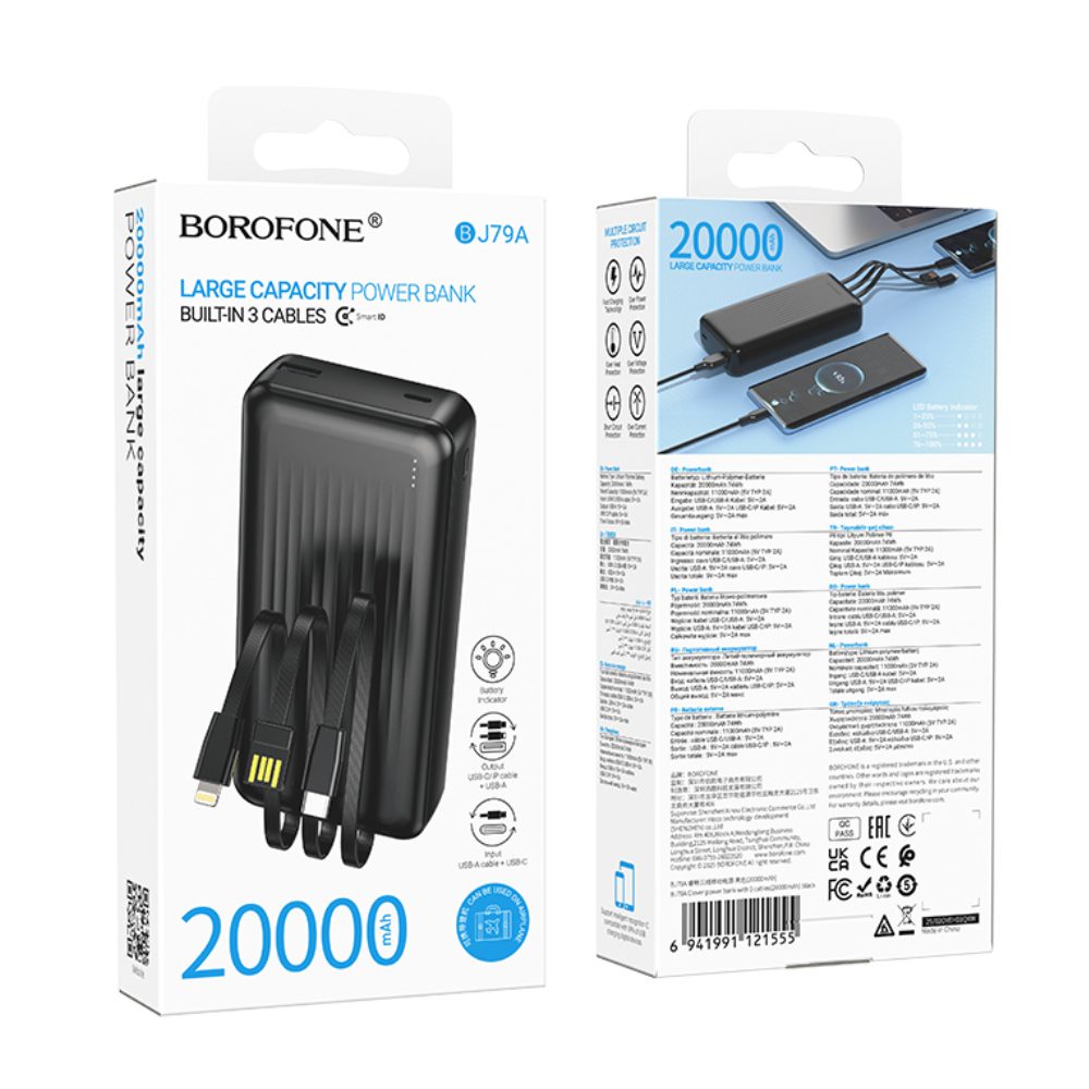 Power Bank Borofone BJ79A 20000mAh με 3 Καλώδια Φόρτισης USB-C, USB-A, Lightning και LED Ένδειξη Μπαταρίας Μαύρο