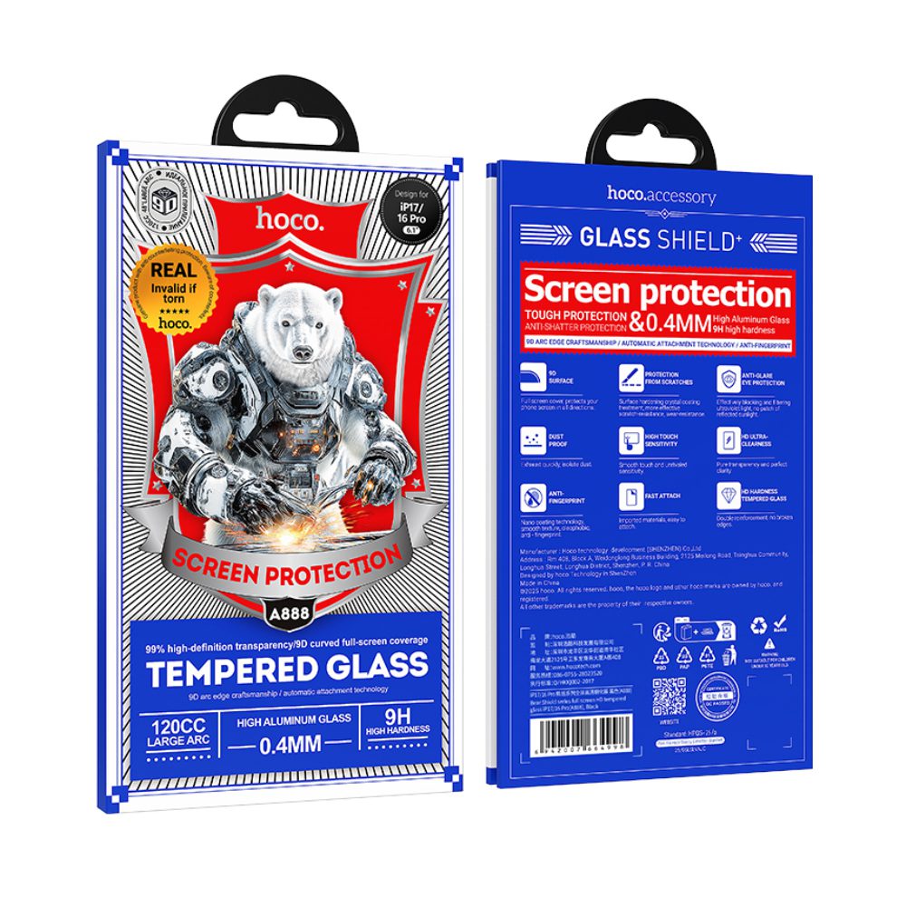 Tempered Glass Hoco Bear Shield A888 HD 4H 0.4mm Large Arc για Apple iPhone 17 iPhone 16 Pro